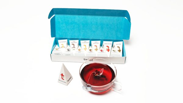 A Christmas themed bundle of 12 pyramids, each containing a single biodegradable, corn silk pyramid teabag – contains 2 of each blend.